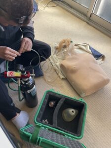 海へ入る前に、陸で要救助者に対する酸素キットを使ったアプローチの仕方を学びました
